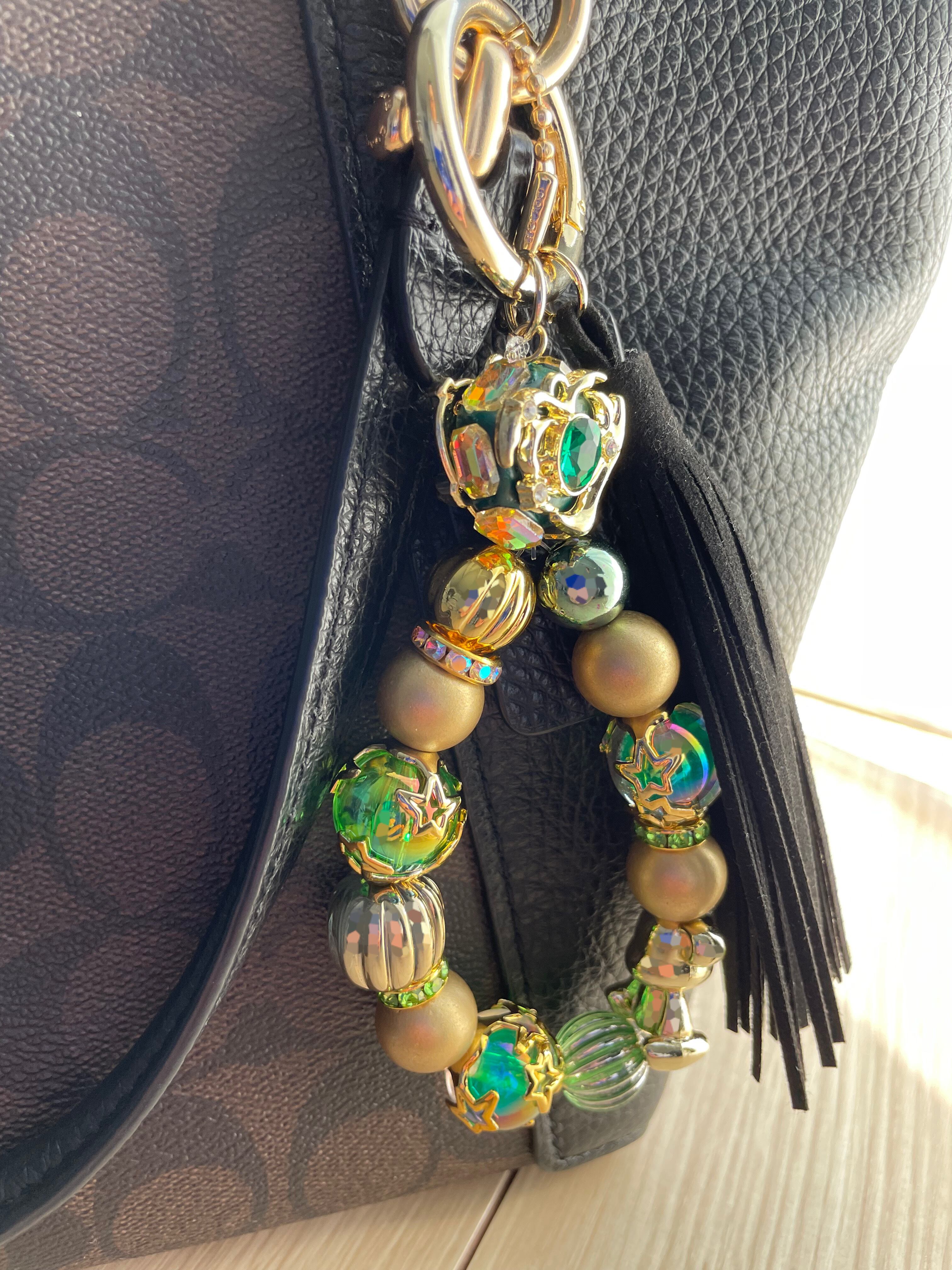 エレガントな装いに華を添える、ゴールドとグリーンのバックチャーム。光を反射させるゴールドと鮮やかなグリーンの組み合わせが、バッグにアクセントを与えます。